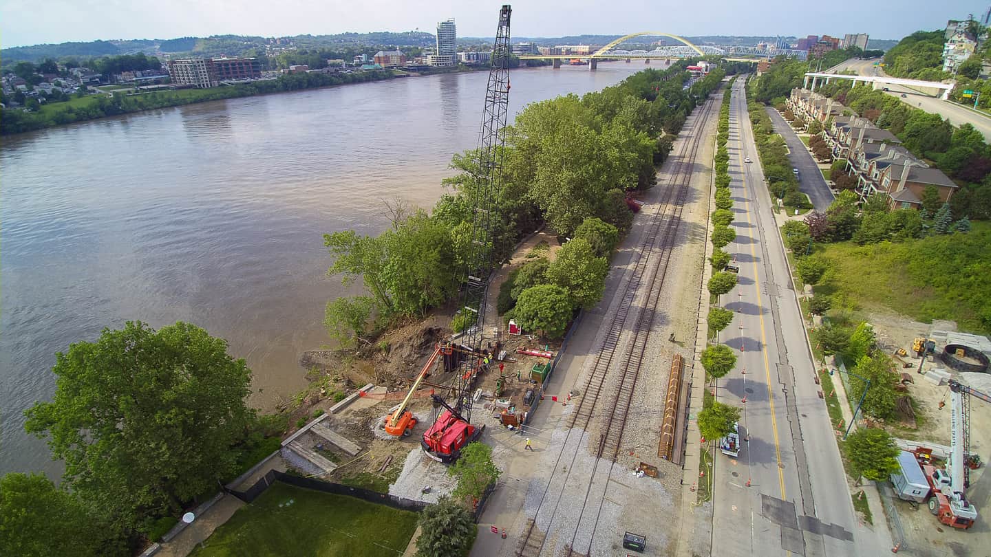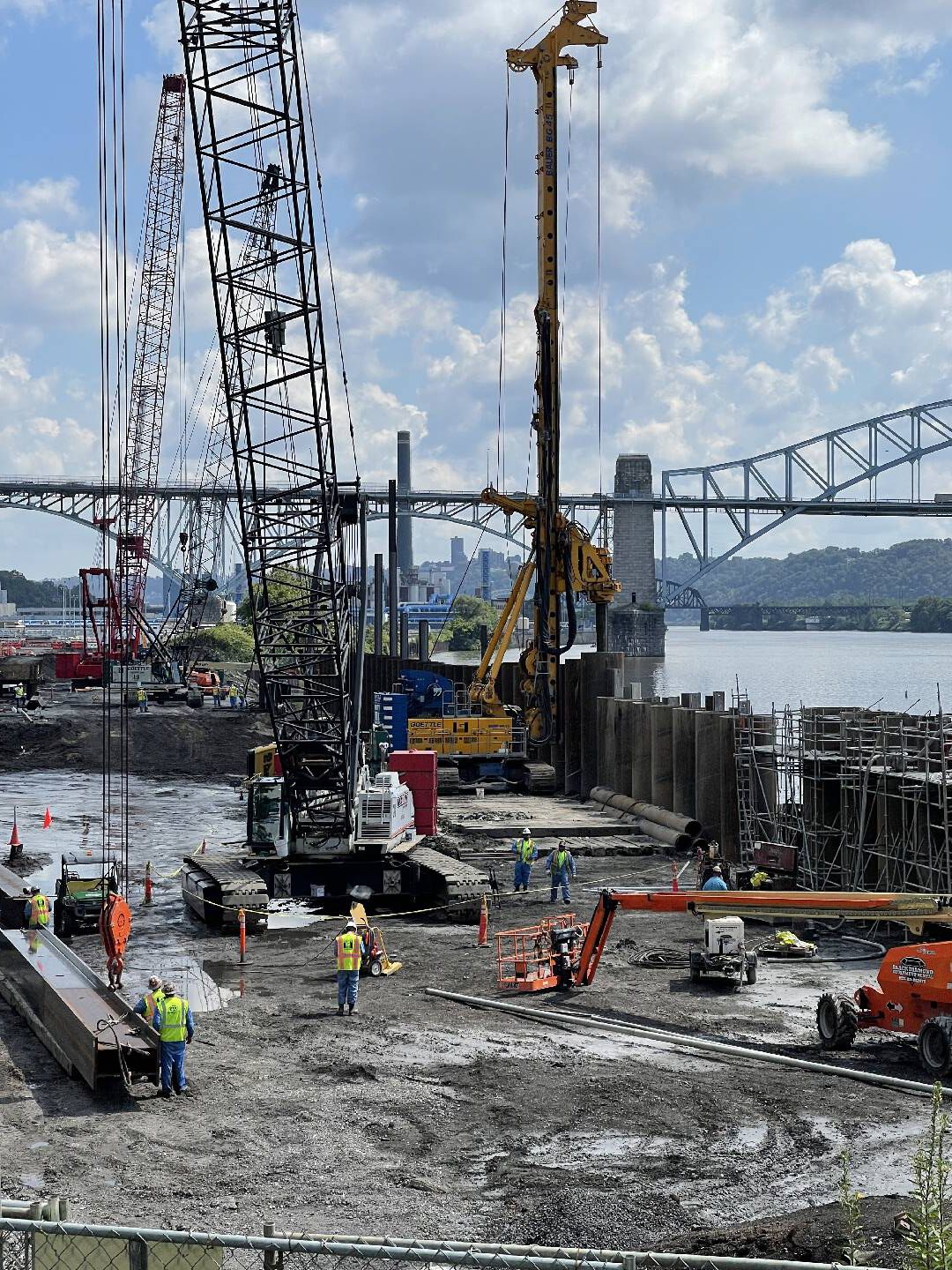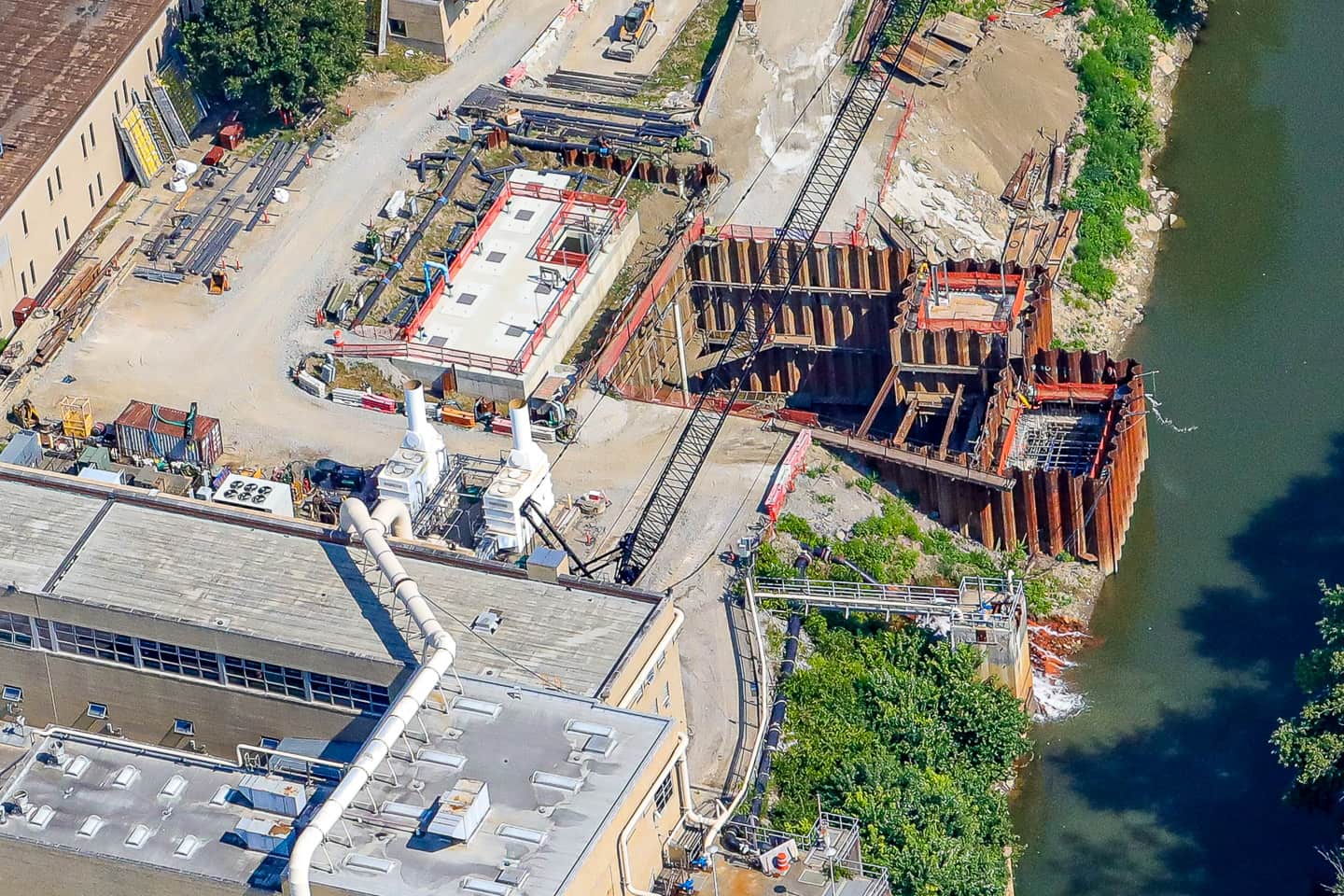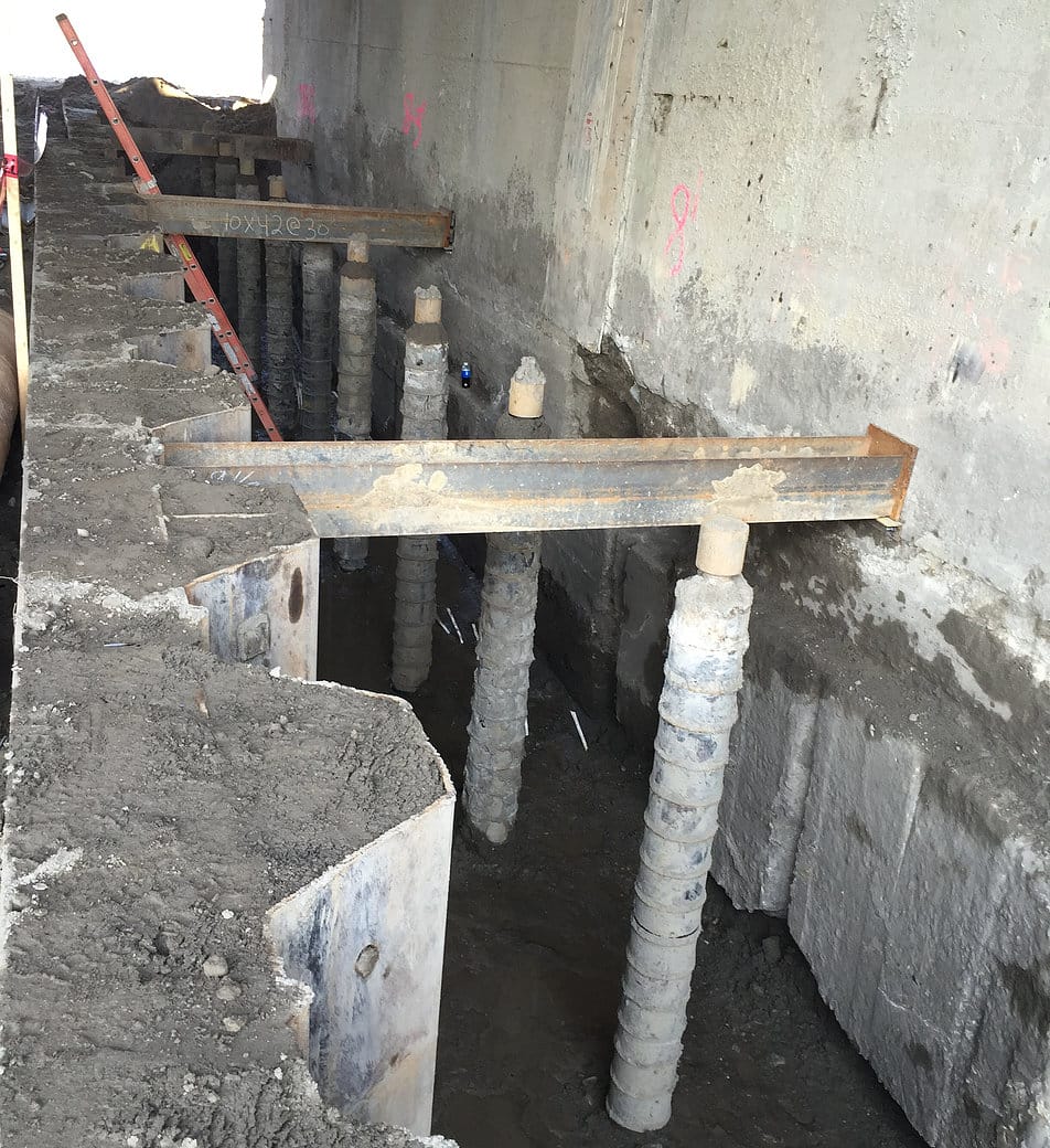 When the retained soil cannot be de-watered, a sheet pile earth retention system is an effective solution. Sheet piles are steel sections in a wide variety of cross-sectional shapes – all with the ability to interlock with one another forming a continuous, watertight wall. The sheets are driven or vibrated into the ground. Cantilever walls are typical, but the sheet piles can be laterally braced to suit the specific needs of the work site. Being manufactured from steel, they offer a high strength material with excellent quality control.